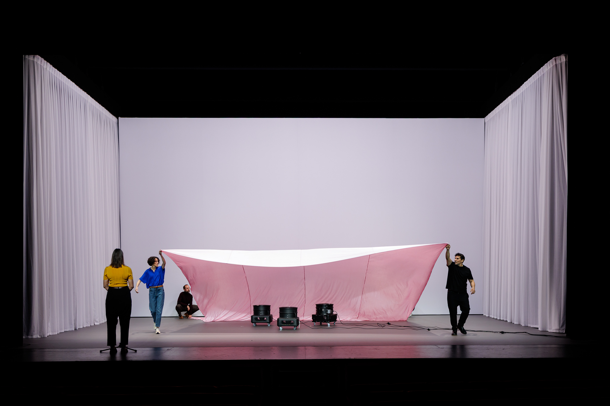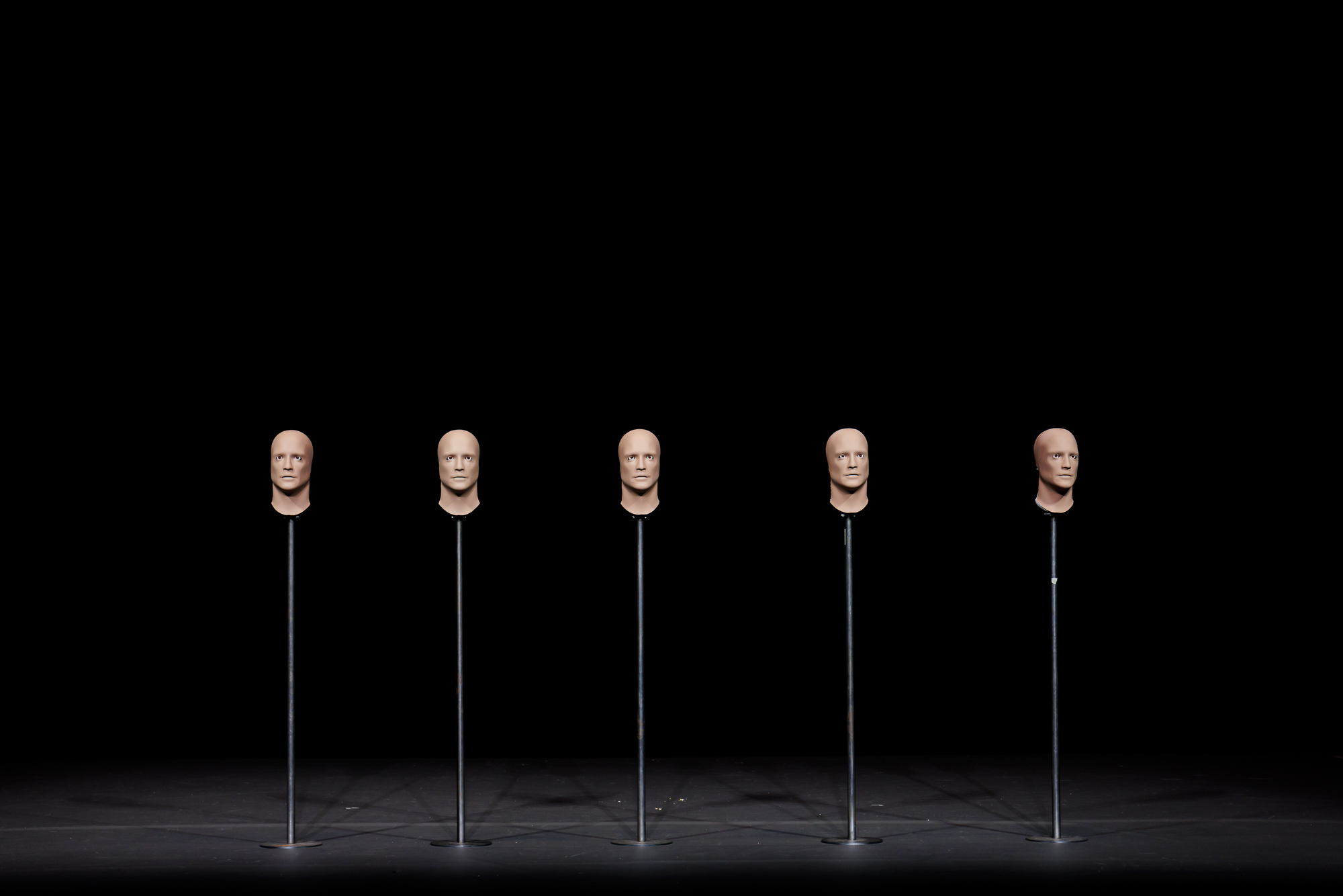 El trabajo interpretativo y físico de los actores y performers Tanya Beyeler, Carmen Collado, Amalia Fernández, Ion Iraizoz y Mauro Molina se funde con las capas más sonoras, escenográficas y tecnológicas que conforman el montaje
